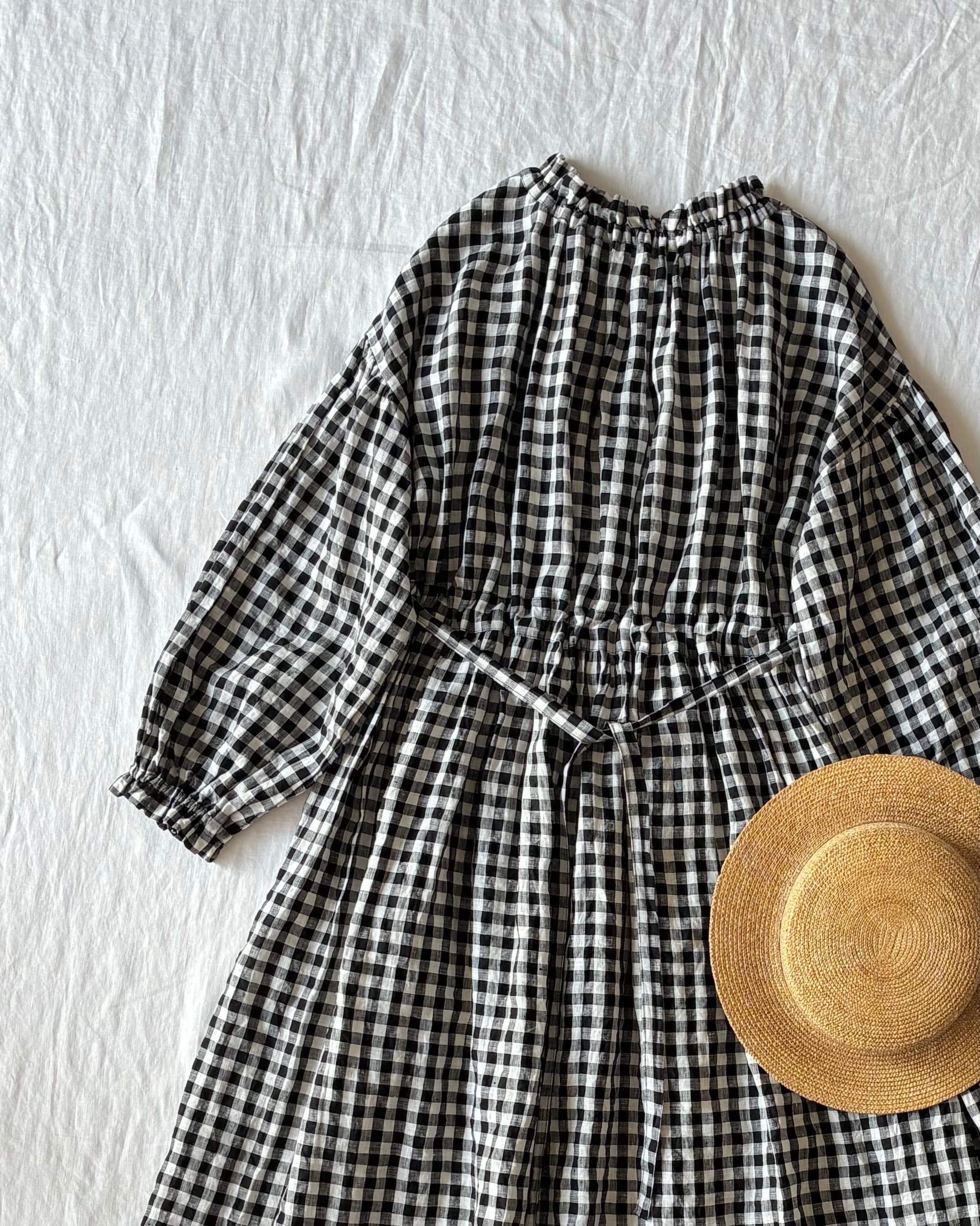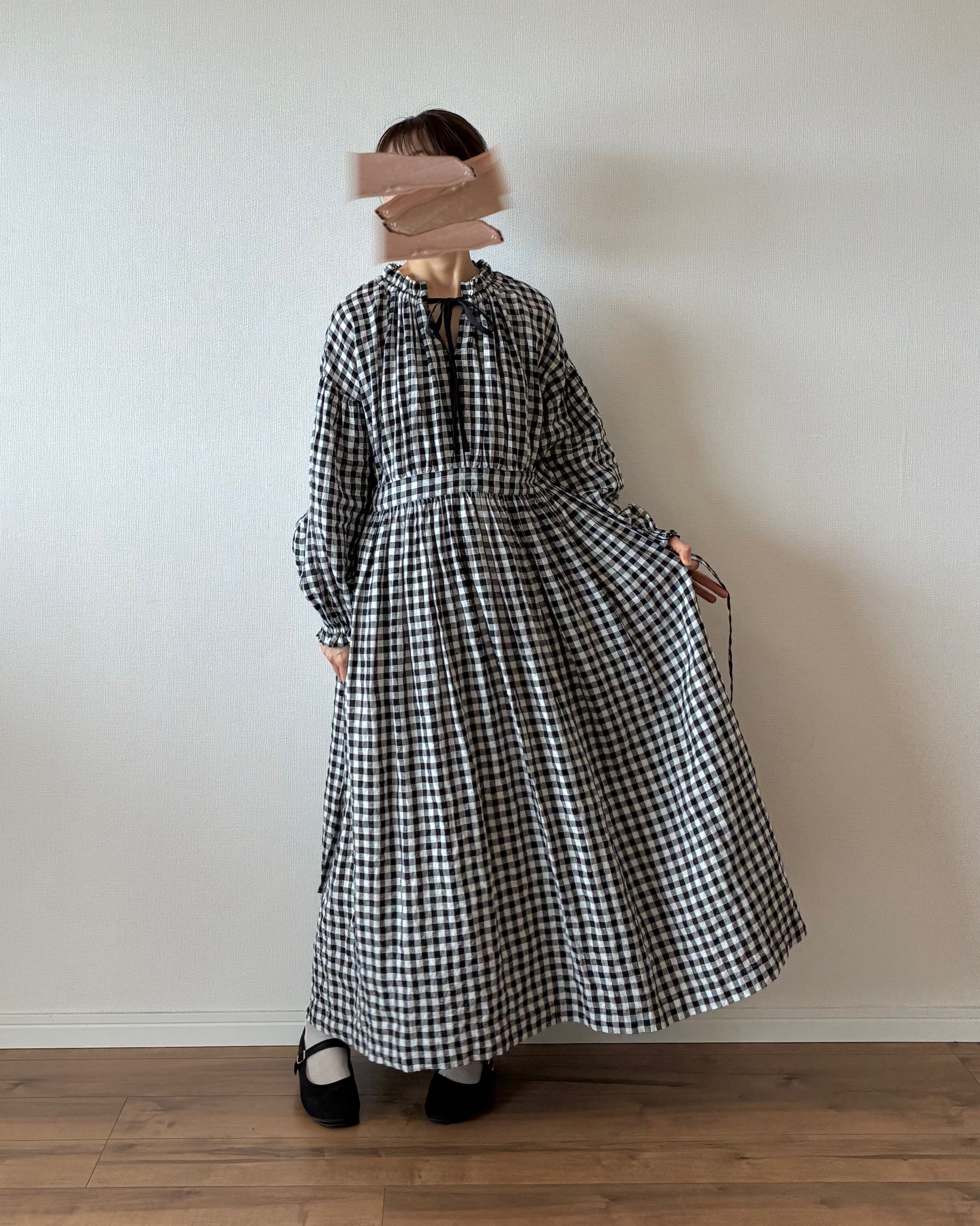 ギャザーネックワンピース(ブラックチェック)