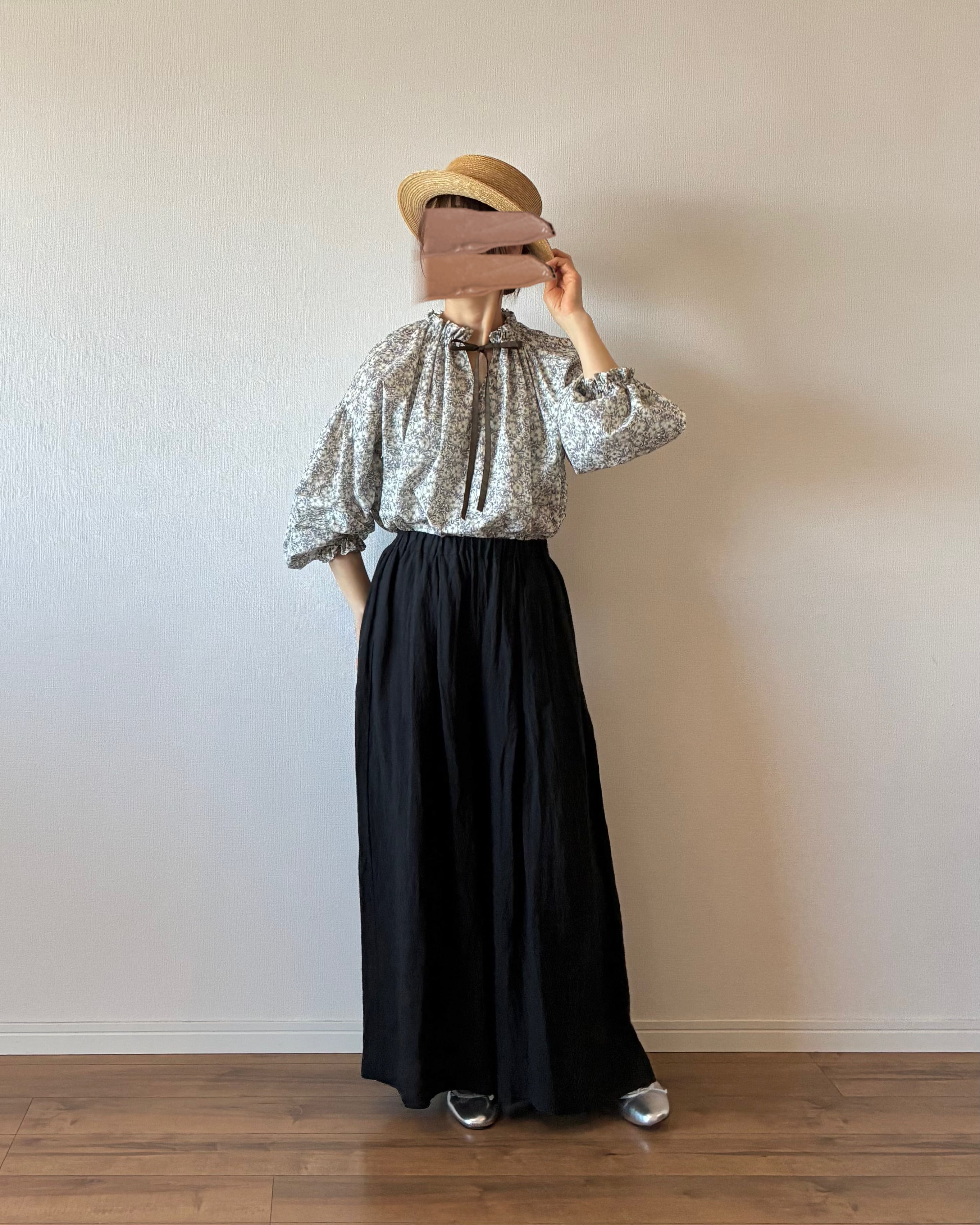 ギャザーネックブラウスとのセットアップでスタイリング完成